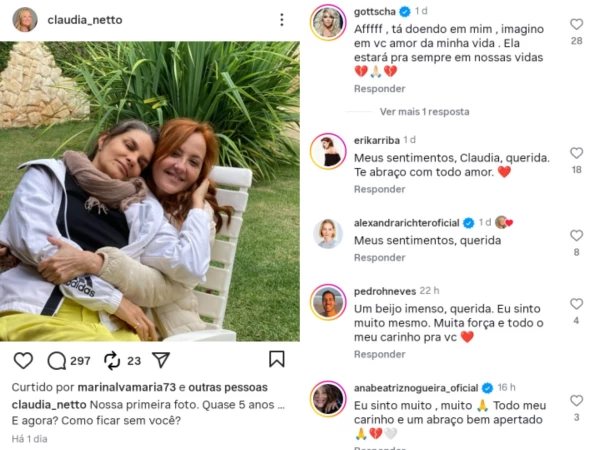 “Nossa primeira foto. Quase cinco anos… E agora? Como ficar sem você?”, escreveu Cláudia Netto em sua publicação no Instagram. Nos comentários, diversos famosos lamentaram a perda e manifestaram solidariedade. A atriz Ana Beatriz Nogueira escreveu: “Eu sinto muito, muito. Todo meu carinho e um abraço bem apertado”. Já o músico Roberto de Carvalho deixou uma mensagem simples e tocante: “Meus sinceros sentimentos”. A atriz Gottscha também demonstrou emoção ao afirmar: “Ela estará pra sempre em nossas vidas”. As homenagens reforçaram o impacto da notícia entre colegas de profissão e admiradores da trajetória de Cláudia.