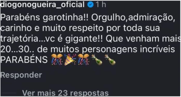 A mensagem, publicada nas redes sociais, chamou atenção pela admiração e pelo tom respeitoso, mesmo após o fim do relacionamento. Diogo Nogueira elogiou a trajetória de Paolla Oliveira destacando o orgulho, o respeito e a admiração pelo trabalho desenvolvido pela atriz desde o início de sua carreira. “Orgulho, admiração, carinho e muito respeito por toda sua trajetória… você é gigante”, disse o músico.